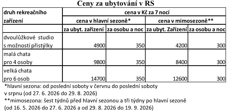 Každý druh rekreačního zařízení je pronajímán jako celek (lze si pronajmout pouze jeden objekt) za cenu uvedenou v tabulce, a to i při nižším počtu rekreantů. Lůžkovou kapacitu nelze překročit. Při nástupu na rekreaci je vybírán za osobu starší 18 let místní obecní poplatek za každý den (cca 20,- Kč) a kauce 1.000,- Kč za ubytovací místo, která je však vrácena zpět po ukončení pobytu a předání ubytovacího místa bez závad.